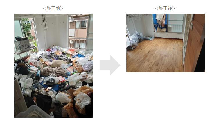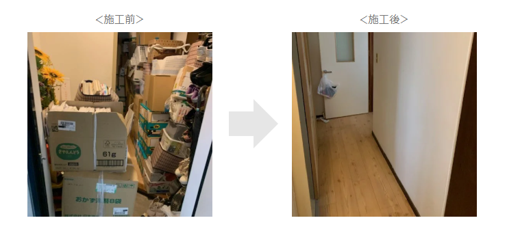 ・圧倒的に短時間で完了する ・心身の負担が一切ない ・分別から搬出 ・処分まで一任できる ・専門的な清掃や消臭も依頼できる |