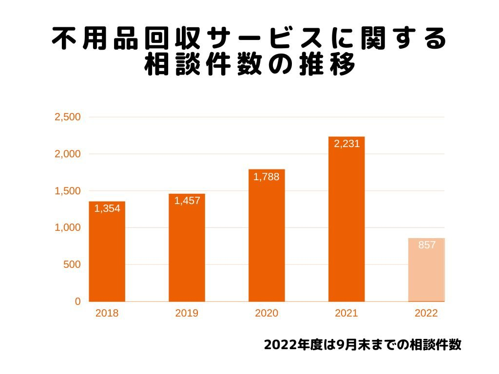 先述の通り、軽トラックでの不用品回収では、料金トラブルや不法投棄といった被害が後を絶たないのも事実です。上記は国民生活センターによる、不用品回収サービスの利用者からの相談件数の推移をまとめたもので、年々相談数が増えていることが読み取れます。
